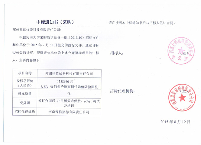 河南大學(xué)2015-962中標(biāo)通知書
