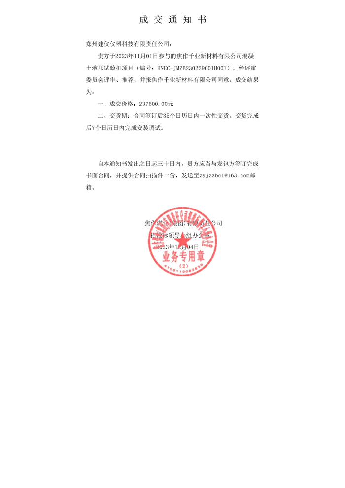 焦作千葉新材料混凝土液壓機(jī)成交通知書